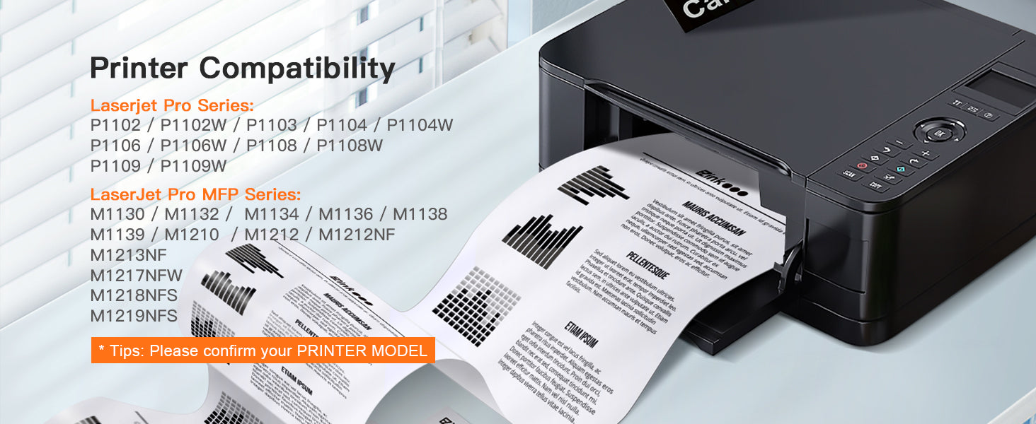 - Compatible for Laserjet Pro Series: P1102 P1102W P1103 P1104 P1104W P1106 P1106W P1108 P1108W P1109 P1109W ; Compatible for LaserJet Pro MFP Series:MFP M1130 M1132 M113 M1136 M1138 M1139 M1210 M1212 M1212NF M1213NF M1217NFW M1218NFS M1219NFS