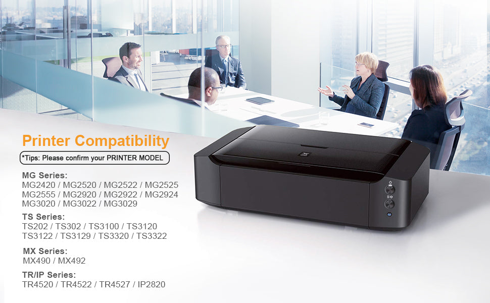 • Compatible Printers: Canon Pixma TR4520, Pixma TR4522, Pixma iP2820, Pixma MG2420, Pixma MG2520, Pixma MG2522, Pixma MG2920, Pixma MG2922, Pixma MG2924, Pixma MX490, Pixma MX492, Pixma MG2525, Pixma MG3020, Pixma MG3022, Pixma MG3029, Pixma TS3120, Pixma TS3122, Pixma TS3320, Pixma TS3322,Pixma TS202, Pixma TS302 Wireless All-in-One Inkjet Printers