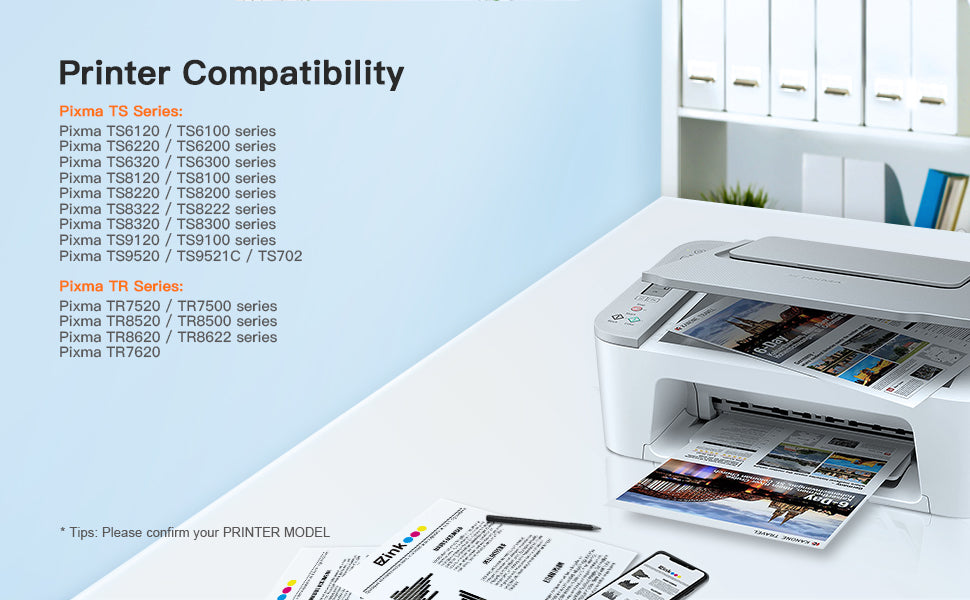 - Printer Compatibility: Canon TR7520, TR7500, TR7620, Pixma TR8520, TR8500, TR8620, TR8622 Pixma TS6100, TS6120, TS6200, TS6220, TS6300, TS6320,TS9520, TS9521C, TS702, Pixma TS8120, TS8100, TS8220, TS8200, Pixma TS8322, TS8222,TS8320, TS8300, TS9120, TS9100 Inkjet Printer