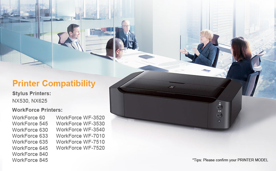 - Compatible Printers: Epson Stylus NX530, Stylus NX625, WorkForce WF-3520, WorkForce 635, WorkForce WF-3530, WorkForce WF-3540, WorkForce WF-7010, WorkForce 645, WorkForce WF-7510, WorkForce WF-7520, WorkForce 60, WorkForce 840, WorkForce 545, WorkForce 630, WorkForce 633, WorkForce 845 Inkjet Printer